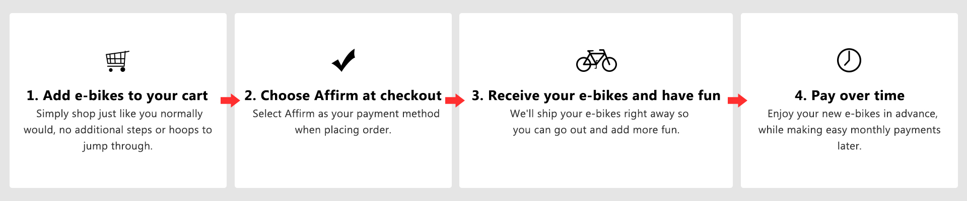 Financing with Affirm is quick and easy, giving you a simple way to complete your purchase, allowing you to spend more time riding and less time worrying. There is no interest or hidden fees, the total you see at checkout is always what you will actually pay. With financing as low as 0% APR for 3 or 6-month option and additional terms up to 18 months.